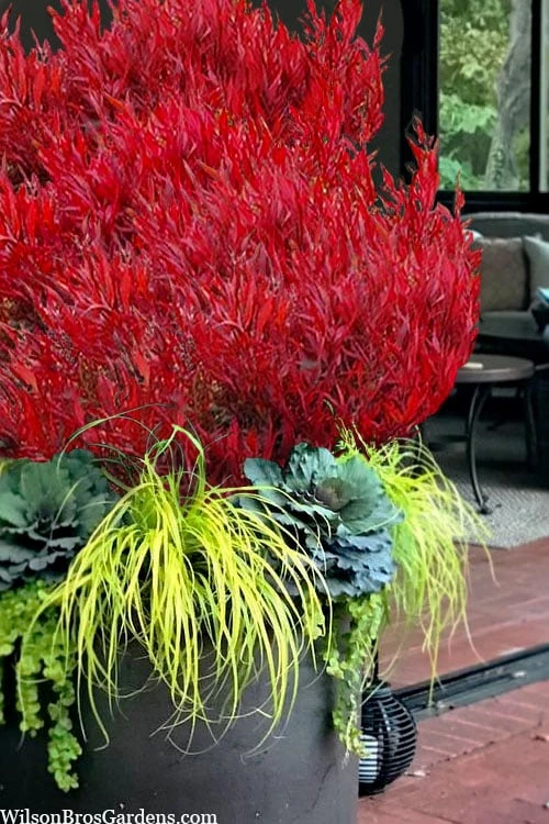 Growing to 3 feet tall and wide, the Bonfire Nandina is ideal for use as a colorful accent in smaller garden spaces and container gardens, or in groupings or as a low evergreen hedge or border in larger landscape borders and home foundation plantings. A fine addition to red theme gardens, rock gardens, and Xeriscape gardens (low water needs).