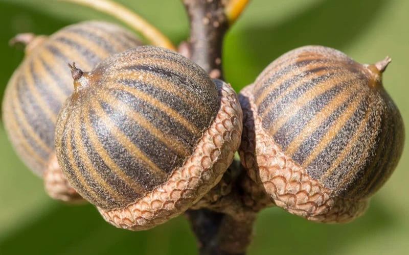 Fruit:Â Â Yes, nuts that are inedible to humans but small animals eat them.1/2 to 1″ inch oval acorns with a thin, saucer-like cap made of small, tight scales